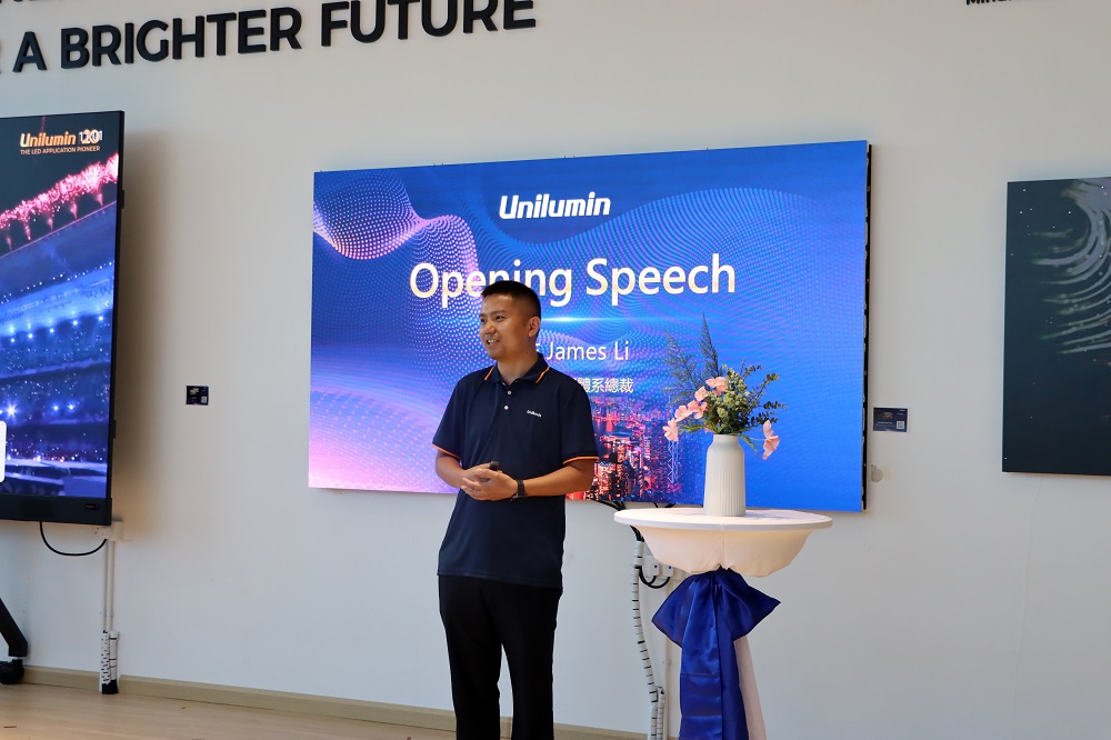 The ceremony began with a warm welcome from James Li, President of Sales and Service, Unilumin Group, who expressed heartfelt gratitude to all customers for their long-standing trust and support. In his address, James highlighted Unilumin’s brand vision and leading position within the global LED industry, reaffirming that the success of the Hong Kong Experience Center is inseparable from the strong partnerships cultivated over the years. He emphasized that the Center embodies Unilumin’s “Three Localizations” strategy—localized service, localized products, and localized sales—designed to bring Hong Kong customers faster response, more diverse service options, and lower service costs.